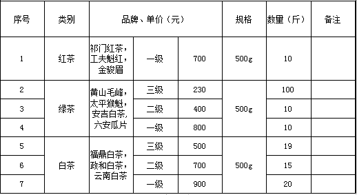 本項(xiàng)目是淮北市建投控股集團(tuán)有限公司2021年度茶葉采購項(xiàng)目,具體如下:![]() 注;1、二級(jí)三級(jí)茶葉采用盒裝或罐裝包裝,一級(jí)采用禮品裝包裝(以采購方實(shí)際需求為準(zhǔn))。 2、重量為除去包裝后茶葉凈重要求。 3、本次茶葉采購具體數(shù)量可能略有變化,按照實(shí)際采購數(shù)量確定。 |