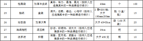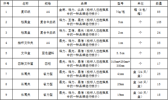| 招標(biāo)范圍 | 包括但不限于辦公用品的生產(chǎn)供貨、包裝、運(yùn)輸、檢測、驗收、質(zhì)保及售后服務(wù)等。如有漏項或缺項,投標(biāo)人承擔(dān)全部責(zé)任。 | ||||||||||||||||