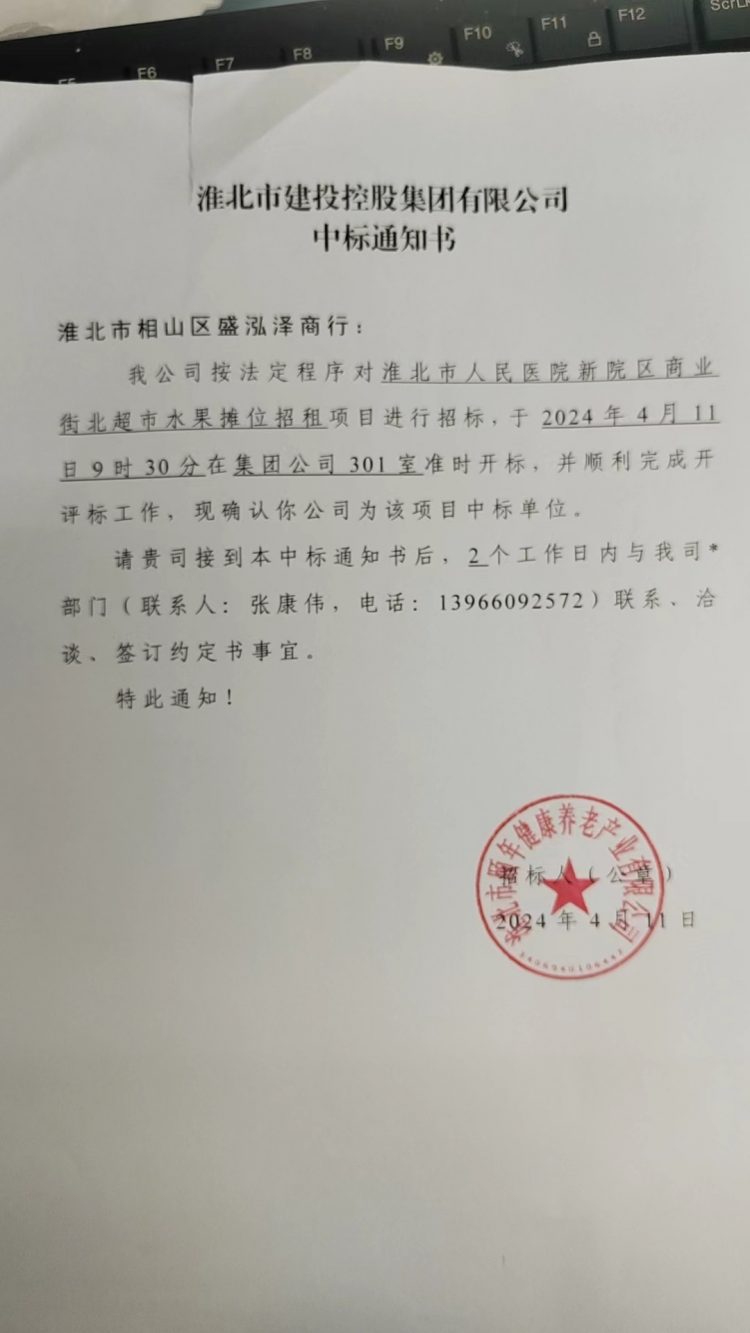 我公司按法定程序?qū)?/span>淮北市人民醫(yī)院新院區(qū)商業(yè)街北超市水果攤位招租項(xiàng)目進(jìn)行招標(biāo),于2024年4月11日9時30分在集團(tuán)公司301室準(zhǔn)時開標(biāo),并順利完成開評標(biāo)工作,現(xiàn)確認(rèn)你公司為該項(xiàng)目中標(biāo)單位。