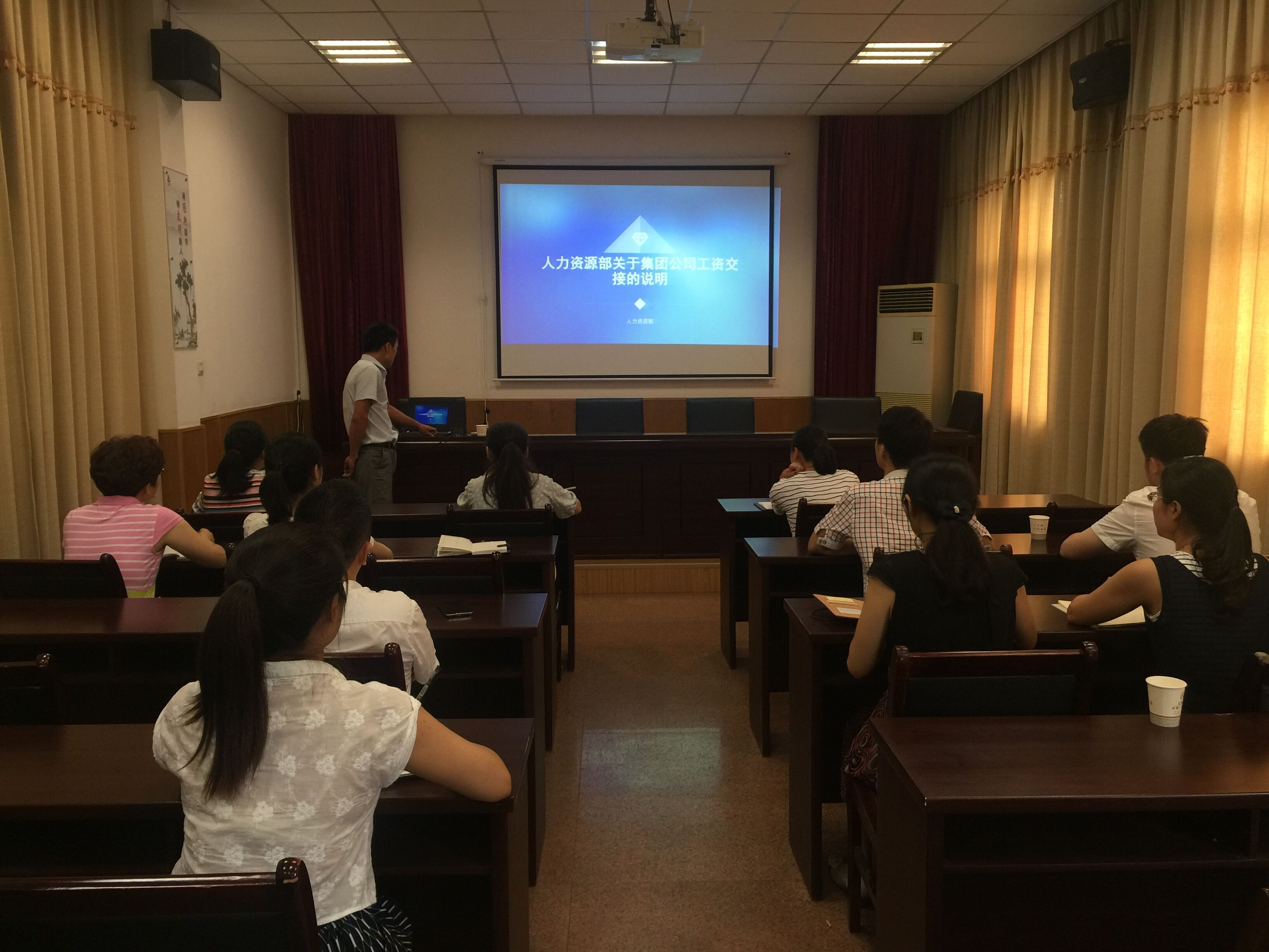 會上,人力資源部唐海峰通過PPT模式,對工資中的基薪、預(yù)支效益薪、勞務(wù)派遣人員費用制作等三部分工作進行了詳細的介紹。