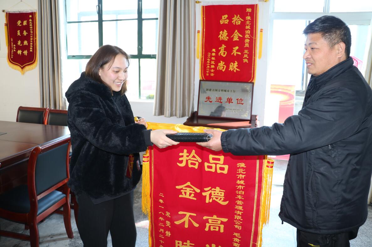 2月23日下午,市民宋女士將一面寫著“品德高尚,拾金不昧”的錦旗送到了城泊公司,她要感謝的是公司收費(fèi)員毛貴菊。
