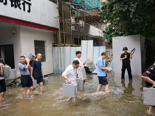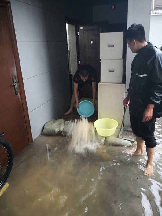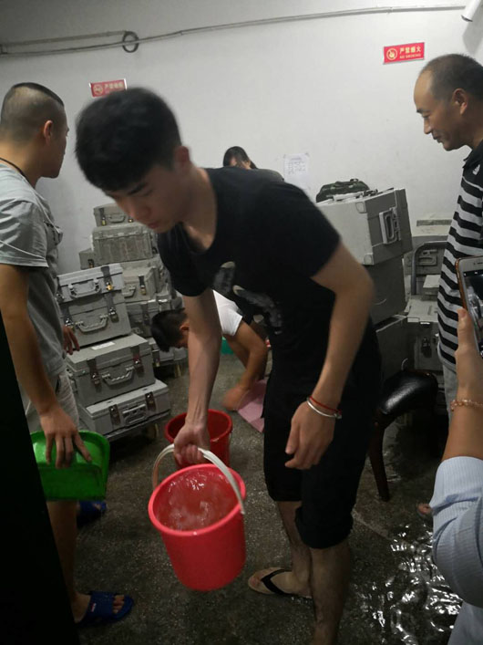 19日清晨,由于雨勢較大,加之街道排水不暢,濉溪農(nóng)商銀行金庫進(jìn)水被浸泡?;幢笔斜0灿邢薰狙哼\(yùn)三中隊(duì)隊(duì)員與銀行金庫人員堅守在第一線,迅速展開自救,用事先準(zhǔn)備好的沙袋將聯(lián)動門圍裹后,用水泵、水盆等工具將積水外排。