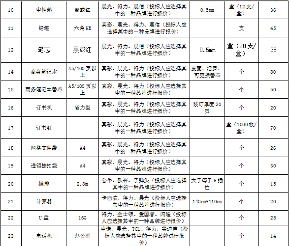 | 招標(biāo)范圍 | 包括但不限于辦公用品的生產(chǎn)供貨、包裝、運(yùn)輸、檢測(cè)、驗(yàn)收、質(zhì)保及售后服務(wù)等。如有漏項(xiàng)或缺項(xiàng),投標(biāo)人承擔(dān)全部責(zé)任。 | ||||||||||||||||