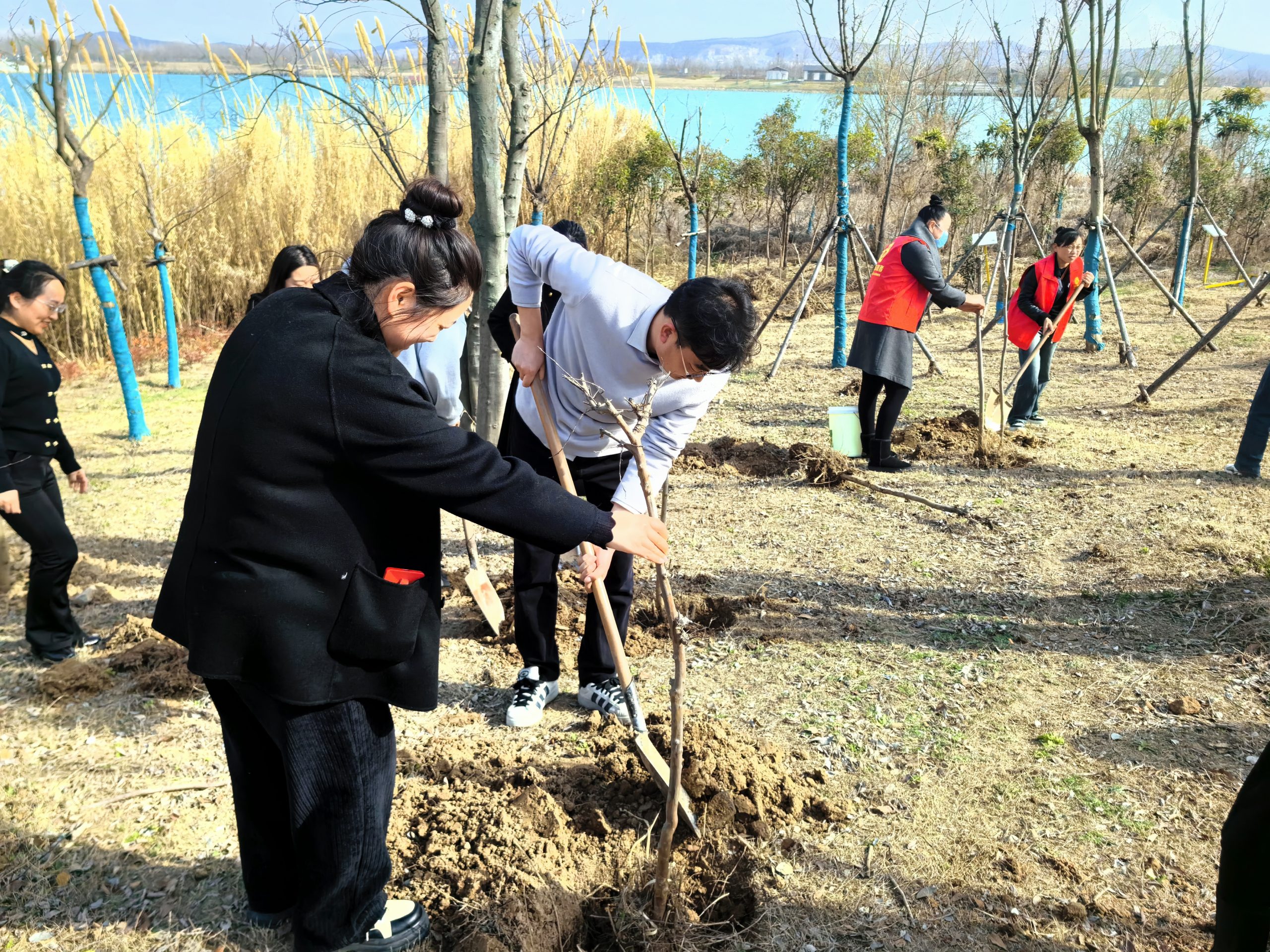 迎著微風(fēng),大家?guī)瞎ぞ?,熱情高漲、干勁十足,積極投入到植樹活動中。揮鍬鏟土、栽苗培土、踩實(shí)土壤,大家協(xié)作配合,現(xiàn)場一派火熱繁忙景象。活動中共栽植30余棵樸樹,栽種樹苗整體錯(cuò)落有致,生機(jī)盎然,為綠金湖增添了一道靚麗的風(fēng)景線。