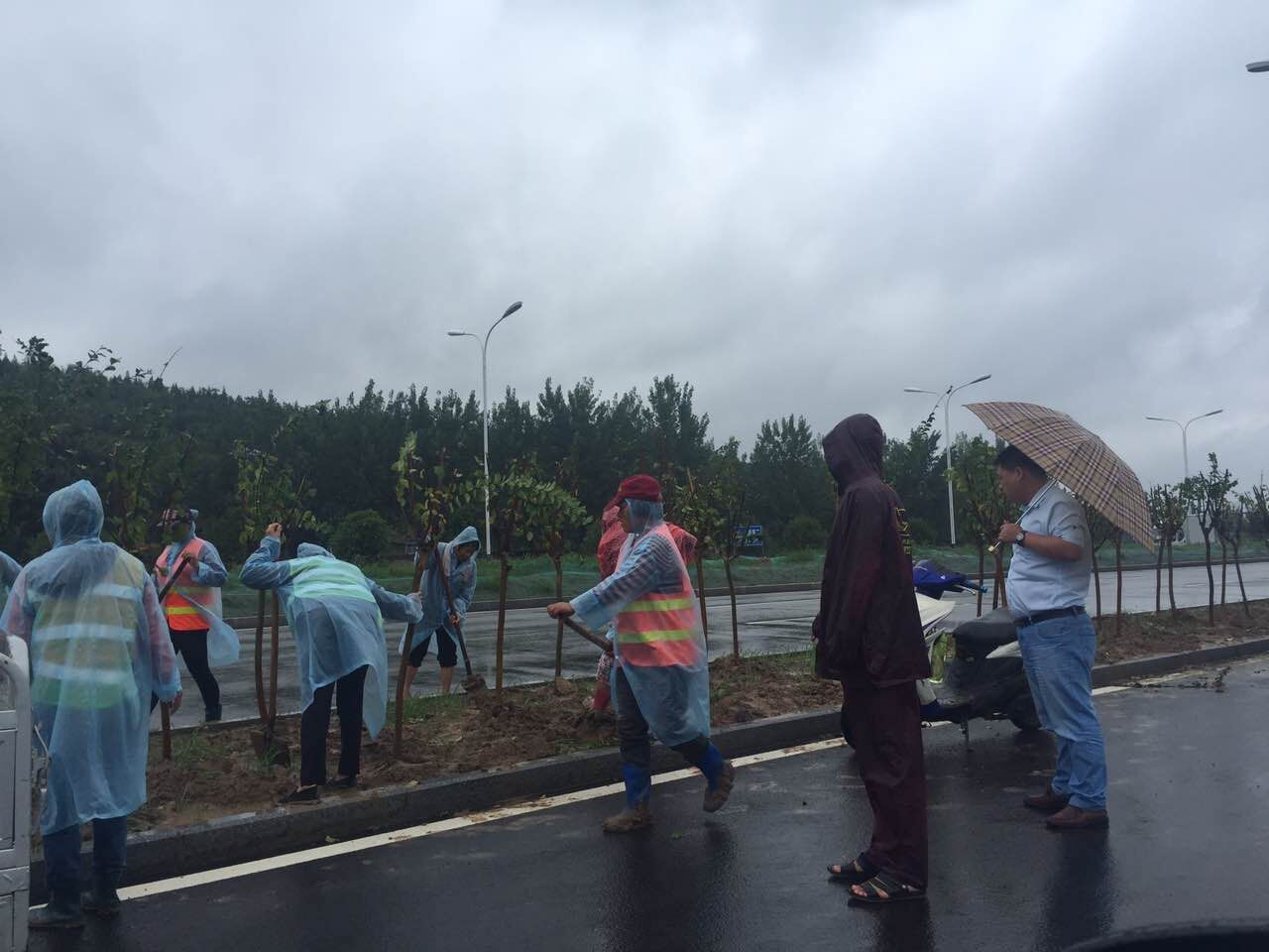 9月10日,公司工程部員工冒著瓢潑大雨在市政府重點(diǎn)工程—梧桐路工程的施工工地上進(jìn)行綠化施工。據(jù)工程部部長張勇介紹,為了響應(yīng)市政府創(chuàng)建工作,抓住雨天種植綠化樹木的成活率高,調(diào)動公司各部門加班加點(diǎn),克服雨中施工的困難,為創(chuàng)建工作做出最大努力。