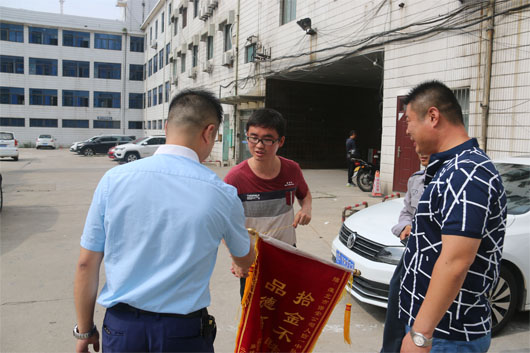 2018年6月19日10時(shí),淮北市保安有限公司派駐淮北車(chē)管所人防一中隊(duì)隊(duì)員房德寶在大廳巡邏執(zhí)勤時(shí)拾到一錢(qián)包,內(nèi)有機(jī)動(dòng)車(chē)駕駛證、多張銀行卡、身份證件及現(xiàn)金600元。第一時(shí)間交給車(chē)管所領(lǐng)導(dǎo)并通過(guò)數(shù)據(jù)系統(tǒng)與家住亳州市渦陽(yáng)縣的張建飛取得聯(lián)系。失主表示萬(wàn)分感謝,并為公司送來(lái)錦旗。