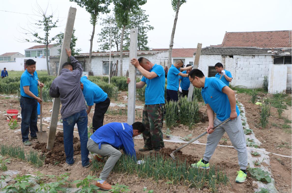 城泊公司為扶貧戶(hù)邵氏種植的100株葡萄樹(shù)苗在初夏的陽(yáng)光下正茁壯成長(zhǎng)。5月17日,城泊公司黨支部利用黨員活動(dòng)日組織黨員為扶貧葡萄樹(shù)安裝葡萄架。
