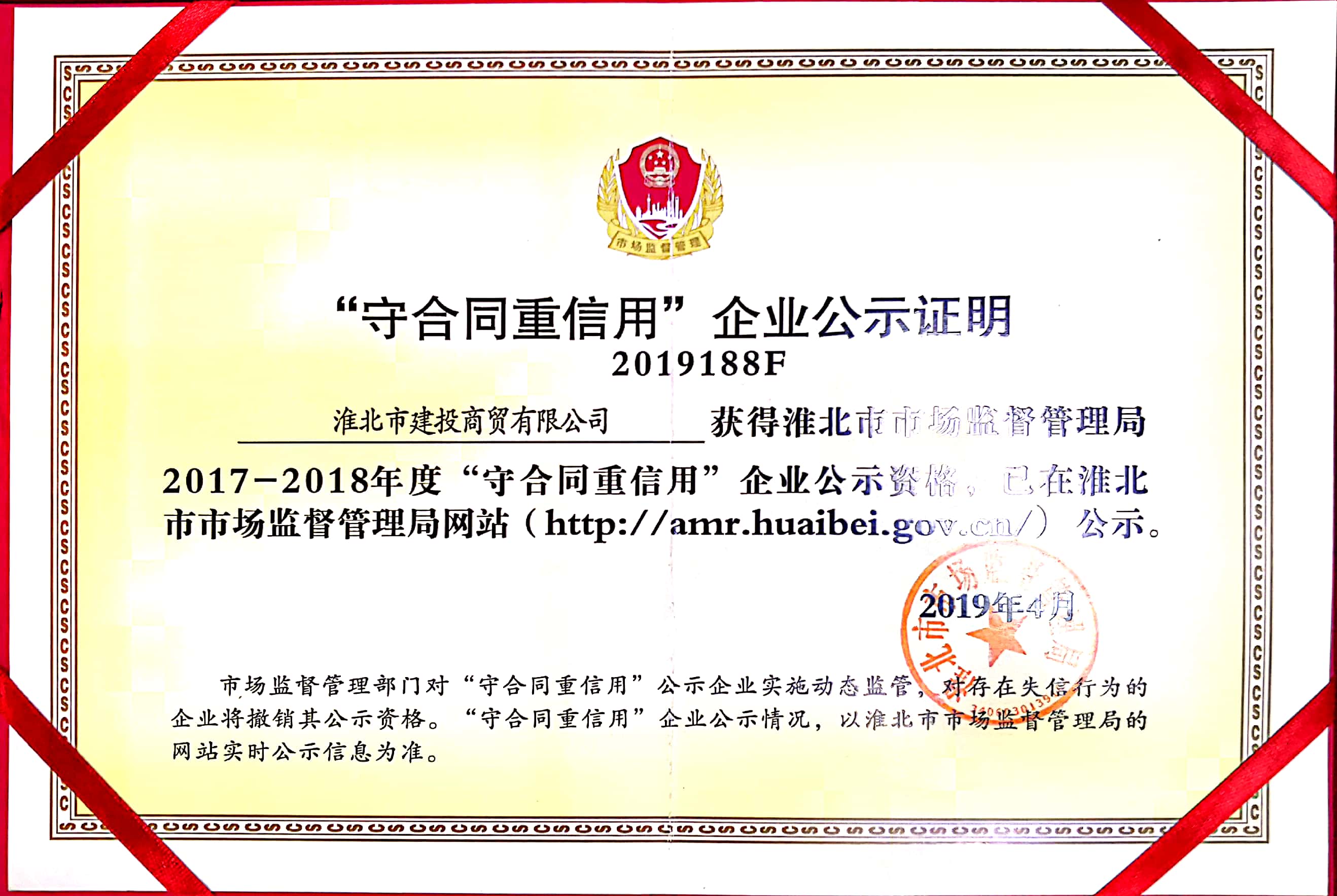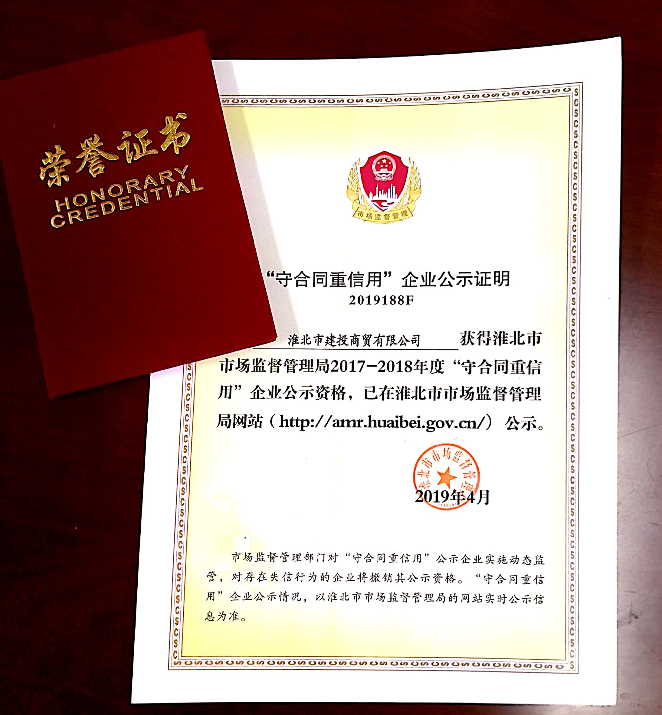淮北市建投商貿(mào)有限公司獲此殊榮,有賴社會各界對公司的信任和支持,“守合同重信用”榮譽是企業(yè)的金字招牌,能有效提升企業(yè)自身誠信管理水平及內(nèi)部管理標準。