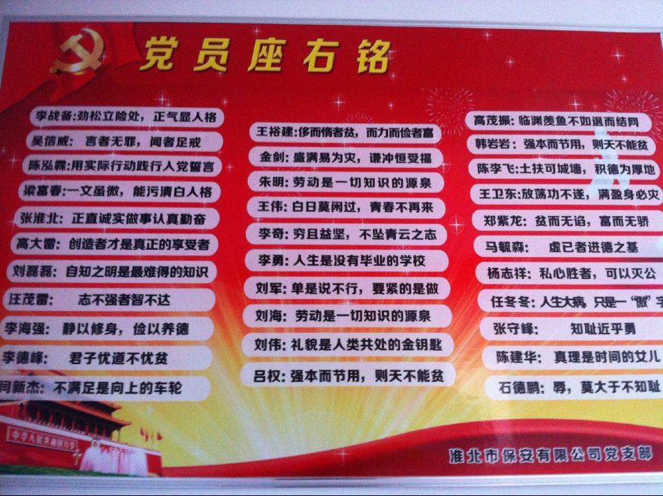 為了進(jìn)一步組織和動(dòng)員廣大黨員更好地為群眾辦實(shí)事、做好事、解難事,淮北市保安公司黨支部結(jié)合“兩學(xué)一做”活動(dòng),在全體黨員中開(kāi)展“座右銘展示”活動(dòng),要求每個(gè)在職黨員以座右銘鞭策自己的行動(dòng),轉(zhuǎn)變工作作風(fēng),進(jìn)一步塑造黨員的良好形象。